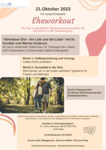 Eheworkout für junge Ehepaare: Abenteuer Ehe: – der Leib und die Liebe; Sa. 21.10.23: Flyer s.u.; Kontakt: Dr. Anna Krenmayr (06767307979)