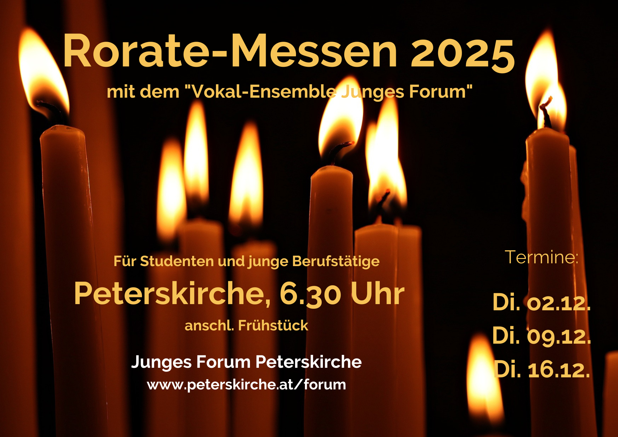 Jeden Dienstag um 6:30 laden wir in die Peterskirche – erleuchtet nur vom stimmungsvollem Kerzenlicht – zur Hl. Messe mit Kurzpredigt ein. Auch diesmal ist sie umrahmt vom Vokal-Ensemble, anschließend gemeinsames Frühstück in der Krypta.